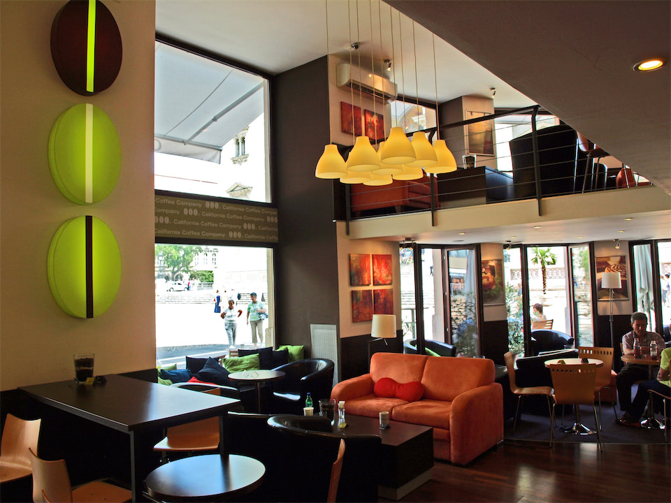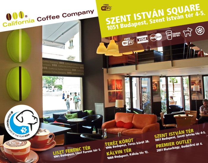 Az Év Kutyabarát Kávézója 2014. - Ez a kávéház leginkább a környékben dolgozó fiatalok és a turisták által látogatott. A panorámás ablakok alatt a kényelmes fotelekben, kanapékon helyet foglalva a Bazilika lélegzetelállító látványa békét és nyugalmat sugároz, míg a kávézó mindig pezsgő hangulata és a legtrendibb zenék folyamatos kíséretet adnak baráti találkozókhoz, munkamegbeszélésekhez. | The Dog Friendly Cafe of the Year 2014 – Budapest - This café is mainly visited by young people working in the neighborhood and by tourists. The panoramic windows over the comfortable armchairs and sofas offer breathtaking views of the cathedral radiating peace and tranquility. The café is always bustling and the coolest music creates a perfect atmosphere to meeting friends and workshops.